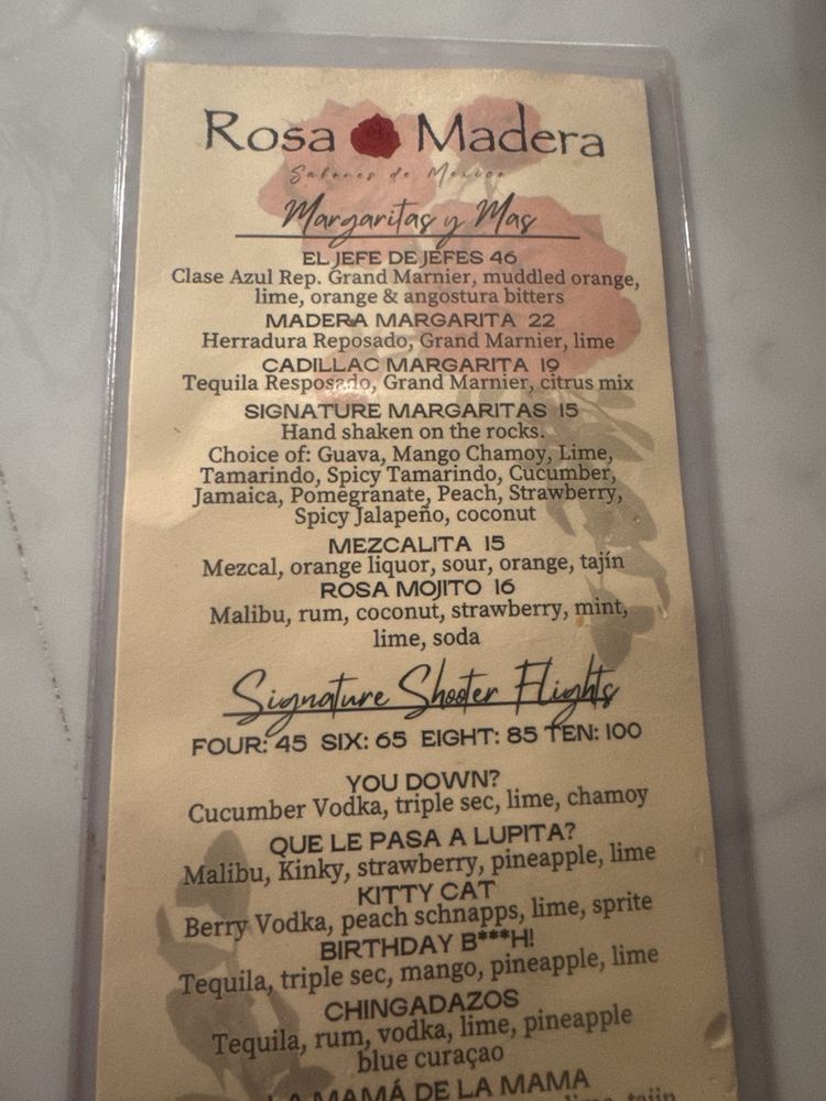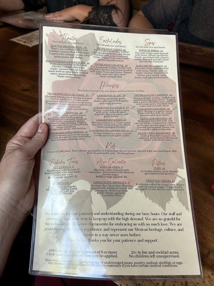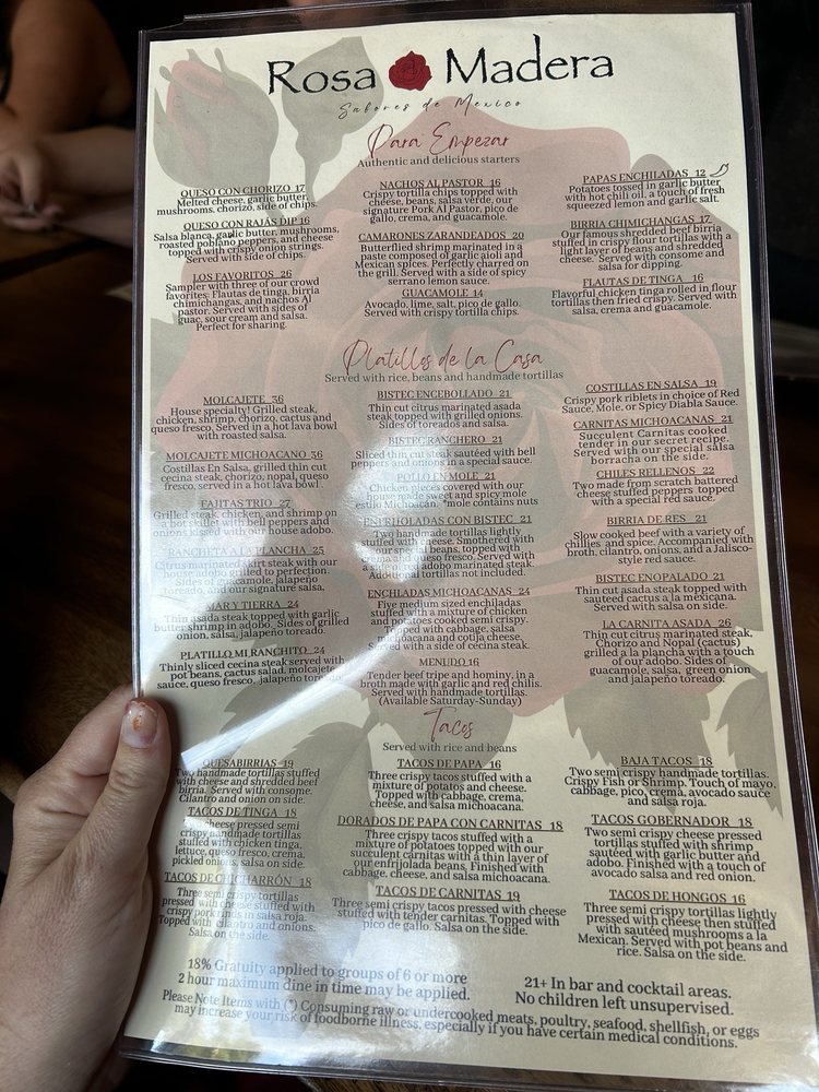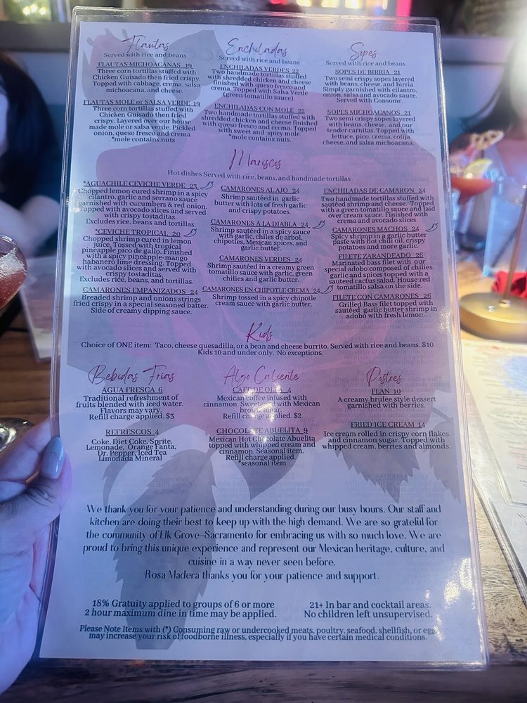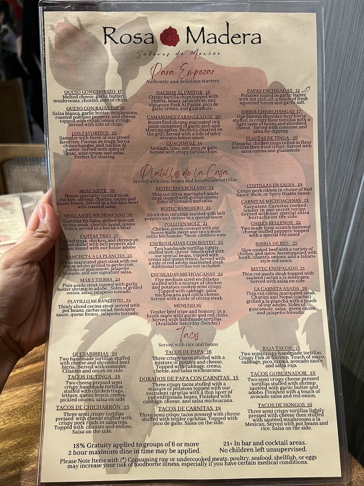 Introducing the menu at Rosa Madera, a Mexican restaurant in Sacramento, CA, offers a vibrant and welcoming atmosphere with a mix of casual, trendy, romantic, and classy vibes. With a Latinx and LGBTQ ownership, this restaurant prides itself on delivering delicious food, excellent service, and top-notch cocktails. Customers rave about the homemade tortillas, flavorful molcajete, and seasonal drinks like horchata and pumpkin spice. The mariachi band adds to the lively ambiance, making it a great spot for celebrations or happy hours. The staff, including servers like Mikey, Angel, and Angel, go above and beyond to ensure a memorable dining experience. Whether you're looking for a quick bite, a special occasion, or a night out with friends, Rosa Madera's diverse menu and welcoming atmosphere make it a must-visit destination.